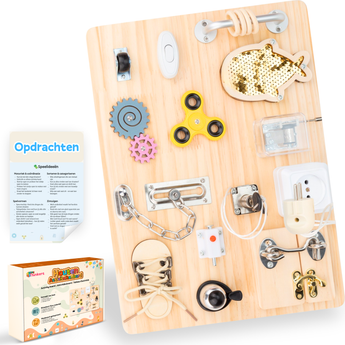Met dit Busy Board kunnen kinderen op hun eigen tempo spelen én leren. Ze draaien tandwielen, schuiven sloten open, drukken op knoppen en maken muziek. Elk onderdeel prikkelt de zintuigen en daagt uit tot zelfstandig ontdekken. Het bord is stevig, mooi afgewerkt en gemaakt voor dagelijks gebruik.