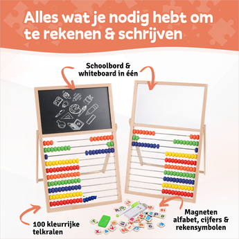 - Inclusief whiteboard, krijtbord én magnetische letters en cijfers