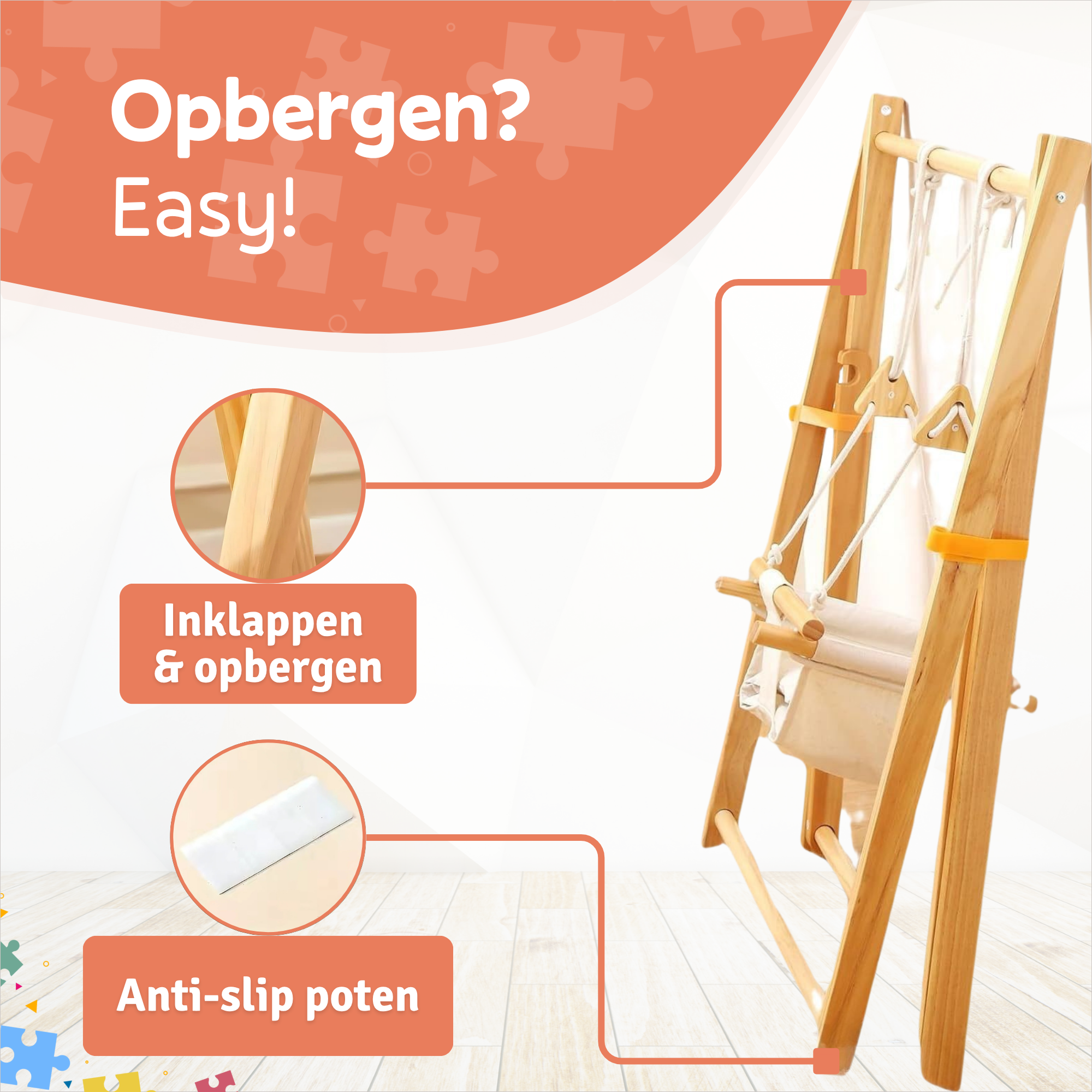 Weinig ruimte? Geen probleem! Dankzij het slimme opvouwbare ontwerp is deze houten babyschommel zo opgeborgen wanneer je hem niet gebruikt. Zo blijft je huis netjes en kun je de schommel snel weer tevoorschijn halen.