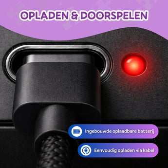 Gemaakt van stevig ABS met afgeronde vormen. Licht in gewicht, prettig vast te houden en bestand tegen enthousiast gebruik. Opladen gaat eenvoudig via USB-C en de batterijlading houdt het lang genoeg vol voor vele speelsessies.